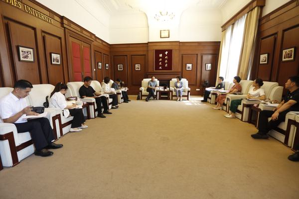 为深入开展学习贯彻习近平新时代中国特色社会主义思想主题教育,学习经验加强交流,与对口支援高校协同高质量发展,7月21日,高级翻译学院干部教师一行赴青海民族大学外国语学院开展学访交流。学院党委书记郭芃、院长李晶与青海民族大学外国语学院党委书记、院长祁富民、党委副书记解伟邦等同志开展座谈交流。 祁富民对来自开云登陆入口高级翻译学院学访团队的到来表示热烈欢迎,并表示,感谢天外高级翻译学院对青海民大外国语学院获批翻译MTI专业的大力支持和帮助。李晶表示,高级翻译学院专程到访青海民大外国语学院,希望学习青海民大外国语学院在开展主题教育、课程思政,少数民族学生管理、校园文化活动等方面的先进经验。郭芃围绕学院发展概况、主题教育开展情况与学院专业方向及特色、师生规模、人才培养、社会服务等方面作了全面介绍。 解伟邦全面介绍了青海民族大学外国语学院发展的历史沿革及办学现状,并从开展主题教育工作情况、学科发展、少数民族学生管理、课程思政和人才培养等方面介绍学院基本概况。随后,双方就高校基层学院深入开展学习贯彻习近平新时代中国特色社会主义思想主题教育工作、学院党建工作、教学管理、师资队伍建设、学生工作等方面