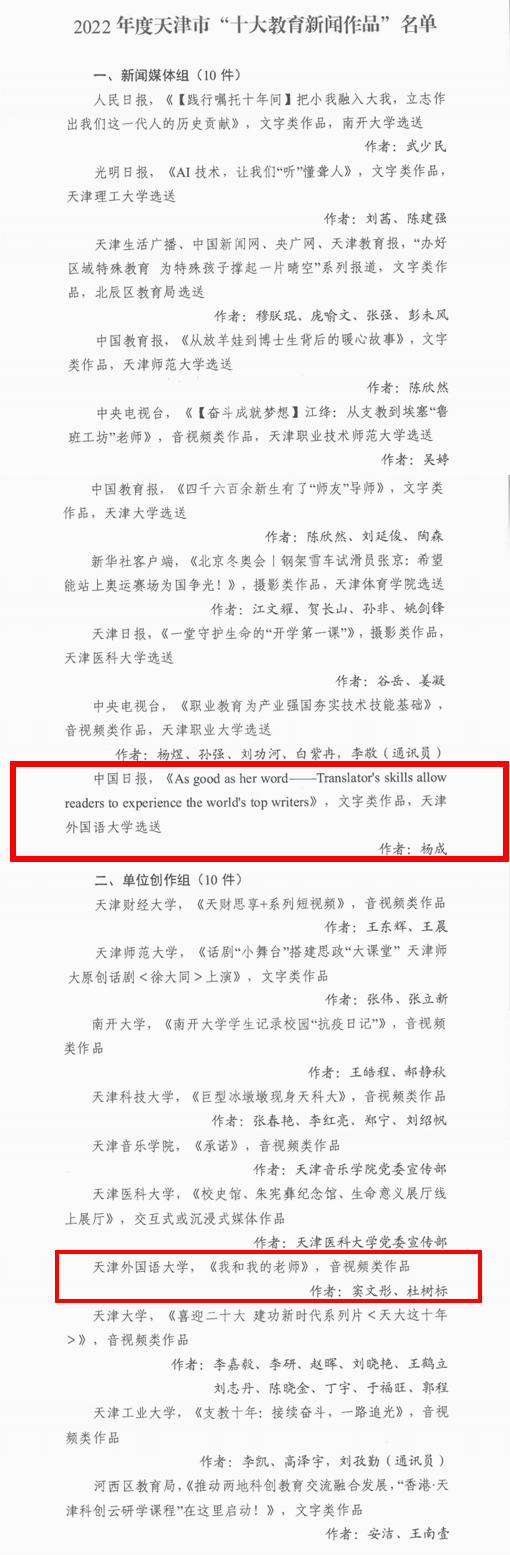 3月27日,由市教育两委组织开展的2022年天津市“十大教育新闻作品”评选结果公布。经过自主申报、专家评审、网上公示,最终评选出新闻媒体组、单位创作组各10件作品。我校报送的由中国日报社天津记者站站长杨成撰写的《As good as her word------Translator's skills allow readers to experience the world's top writers》入选新闻媒体组“十大教育新闻”;由党委宣传部窦文彤、杜树标老师拍摄制作的短视频《我和我的老师》入选单位创作组“十大教育新闻”。 瑞典斯德哥尔摩当地时间2022年10月6日13:00(北京时间19:00),法国作家安妮·埃尔诺荣获2022年度诺贝尔文学奖。开云登陆入口欧洲语言文化学院法语系教授郭玉梅作为安妮·埃尔诺的小说《耻辱》《位置》和《一个女人》的译者,以及另一位诺奖得主、2008年荣获诺贝尔文学奖的勒·克莱齐奥所创作的《金鱼》一书的译者,接受了中国日报社天津记者站站长杨成的采访。《As good as her word》一文在中国日报、网、端、海外社交媒体刊发,海外落地,受到国内