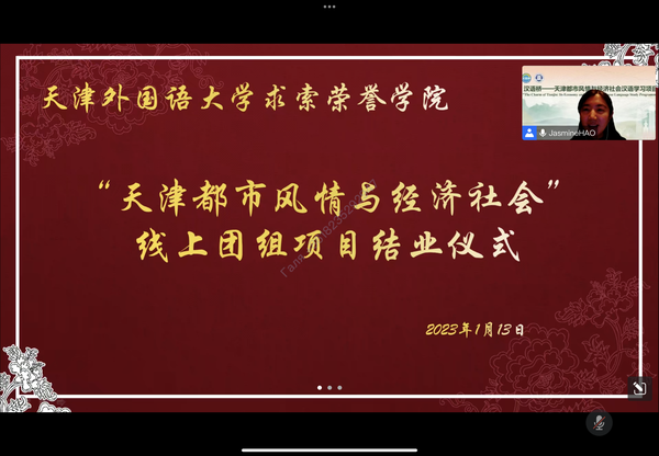 1月13日,由教育部中外语言交流合作中心主办、我校求索荣誉学院承办的“天津都市风情与经济社会”线上交流项目结业仪式顺利举行。结业仪式由求索荣誉学院教师郝卓主持。求索荣誉学院班子成员及师生代表参加结业仪式。 副院长李薇对学员们为期八天的学习情况进行总结,并给予高度肯定。她表示,此次“天津都市风情与经济社会”线上交流项目不仅提高了学员们的商务汉语水平,也让外国友人多方面地了解了中华文化,了解了天津这座城市的魅力。李薇为达到考核要求的学员颁发了结业证书。 四位外国学员代表进行了发言。来自韩国的姜卜先同学是一名热爱中国文化、即将面临高考的高中生,他的理想职业是国际汉语教师,通过此次学习,他更加坚定了自己学好中国文化的决心。来自孟加拉国的孟含同学表示,本次项目内容丰富多彩,老师们每次都耐心解答学员们的问题,他本人的商务汉语交际能力也得到了提升。来自刚果的程颢同学表示,通过为期八天的学习,自己了解到了天津对于中国经济发展的重要作用,学习到了很多商务方面的生字,加深了对中国语言的掌握,对中国有了更充分的认识。来自日本的渡边麻衣同学表达了自己对助教和老师的感谢,她很开心能够在这样一种“有