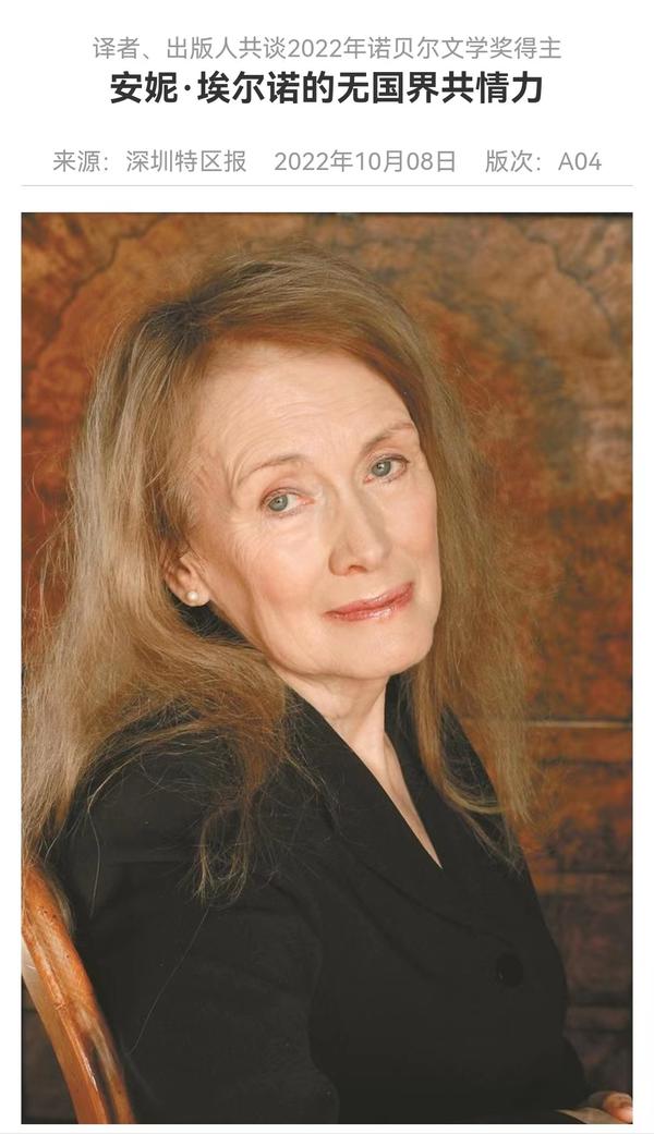 应法国驻华使馆邀请,郭玉梅教授曾参加安妮·埃尔诺与中国译者见面会活动瑞典斯德哥尔摩当地时间2022年10月6日13:00(北京时间19:00),法国作家安妮·埃尔诺荣获2022年度诺贝尔文学奖。由开云登陆入口欧洲语言文化学院法语系教授郭玉梅翻译的安妮·埃尔诺的小说《耻辱》《位置》和《一个女人》于2003年出版,之后,她在《法国研究》上发表了论文《追求“再现真实”与“内心流亡”的安妮·埃尔诺》。据悉,上海人民出版社即将再版郭玉梅的译著《一个男人的位置》和《一个女人的故事》。同时,我校法语系陈淑婷老师翻译的安妮·埃尔诺小说《一个女孩的记忆》也将同时出版。除了埃尔诺,郭玉梅也是另一位诺奖得主、2008年荣获诺贝尔文学奖的勒·克莱齐奥作品的译者。早在2000年,她翻译出版了勒·克莱齐奥撰写的《金鱼》一书,并于2008年再版。字斟句酌,精益求精,译著的出版为中外文明交流互鉴架起“心桥”。澎湃新闻、深圳特区报等媒体对此进行了采访报道。郭玉梅长期在一线从事教学和科研工作,是法语学科带头人,硕士研究生导师,2013年获评天津市教学名师。曾任教育部教学指导委员会法语分委员会委员。参与完成国家社会科学基
