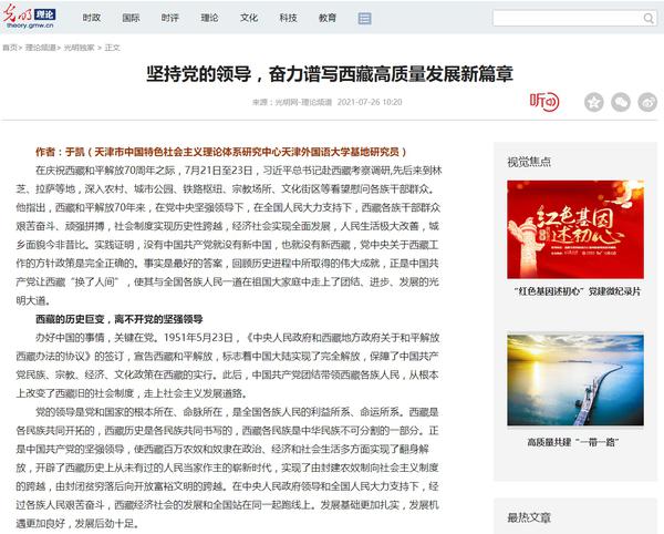 在庆祝西藏和平解放70周年之际,7月21日至23日,习近平总书记赴西藏考察调研。7月26日,《光明网》理论频道刊发我校马克思主义学院于凯老师文章《坚持党的领导,奋力谱写西藏高质量发展新篇章》。文章指出,实践证明,没有中国共产党就没有新中国,也就没有新西藏,党中央关于西藏工作的方针政策是完全正确的。西藏的历史巨变,离不开党的坚强领导;西藏的好日子,离不开党的好政策;西藏的高质量发展,离不开全面贯彻新时代党的治藏方略。正是中国共产党让西藏“换了人间”,使其与全国各族人民一道在祖国大家庭中走上了团结、进步、发展的光明大道。光明网截图全文转载如下:坚持党的领导,奋力谱写西藏高质量发展新篇章作者:于凯(天津市中国特色社会主义理论体系研究中心开云登陆入口基地研究员) 在庆祝西藏和平解放70周年之际,7月21日至23日,习近平总书记赴西藏考察调研,先后来到林芝、拉萨等地,深入农村、城市公园、铁路枢纽、宗教场所、文化街区等看望慰问各族干部群众。他指出,西藏和平解放70年来,在党中央坚强领导下,在全国人民大力支持下,西藏各族干部群众艰苦奋斗、顽强拼搏,社会制度实现历史性跨越,经济