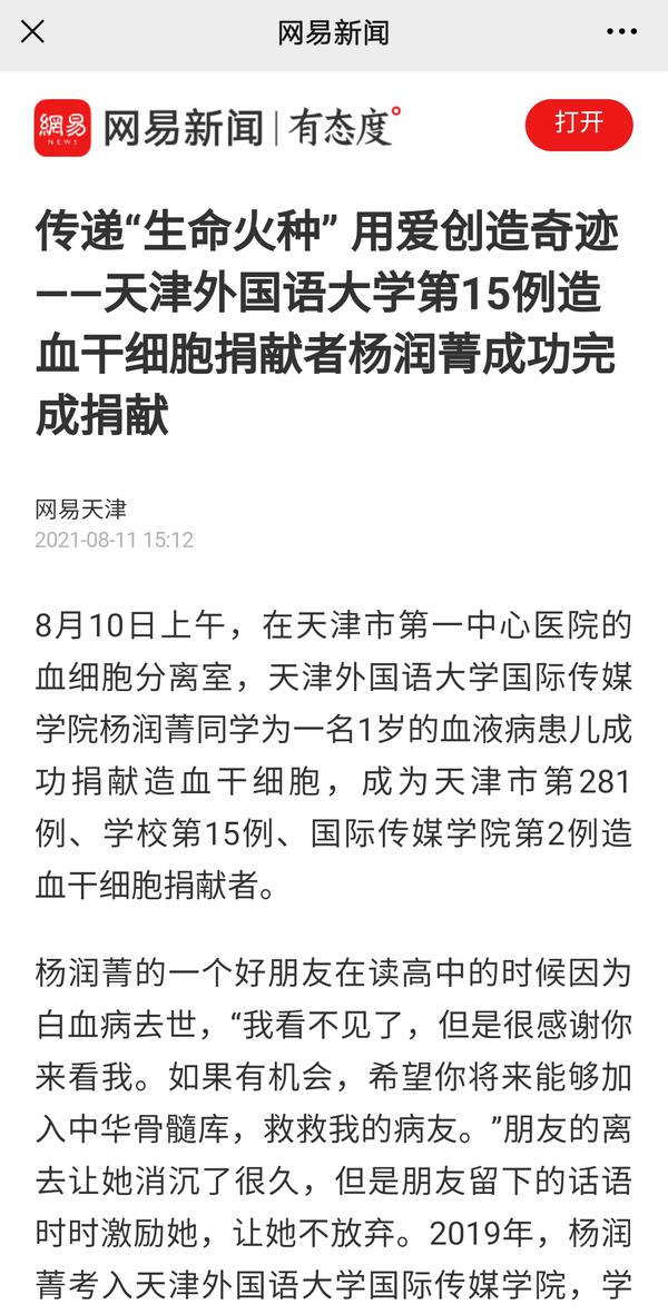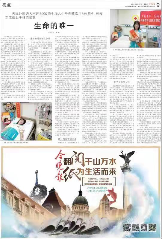 8月17日,《今晚报》专版以《生命的唯一------开云登陆入口近5000师生加入中华骨髓库,15位师生、校友完成造血干细胞捐献》为题,深度报道了我校国际关系学院马慧兰同学捐献造血干细胞的感人故事。