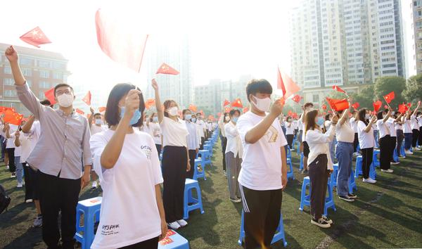鲜衣怒马少年时,不负韶华行且知。今年是中国共产党成立100周年,全体新生用铿锵誓言表达决心, 以实现中华民族伟大复兴为己任,成为“可堪大用、能担重任的栋梁之才”。因为疫情防控的要求,学校未能邀请学生亲友出席开学典礼,专门安排中国移动5G和商务进行全程视频直播,亲友实时浏览量近6000人次。在激昂的校歌声中,全体新生放飞梦想,以奋斗之青春书写崭新人生华章!