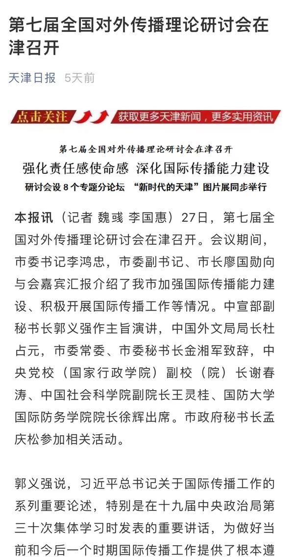 9月28日,天津新闻以《第七届全国对外传播理论研讨会在津召开》为题,进行了报道。