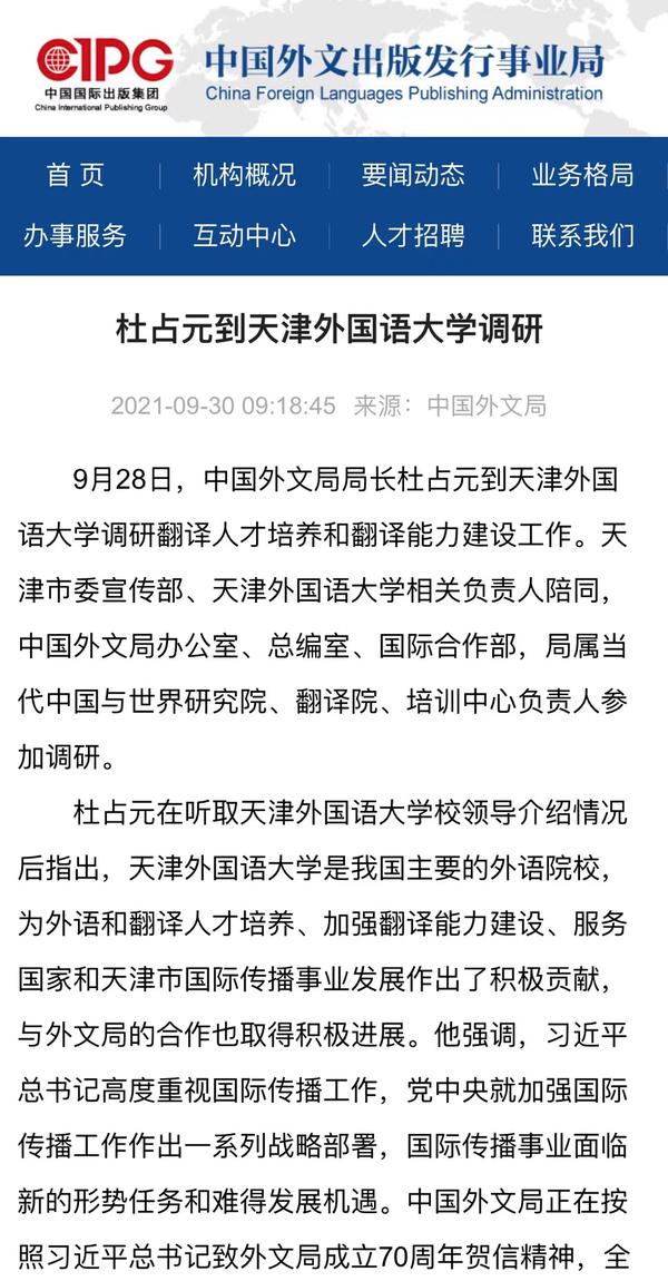 9月30日,中国外文局官网以《杜占元到开云登陆入口调研》为题,进行了报道。