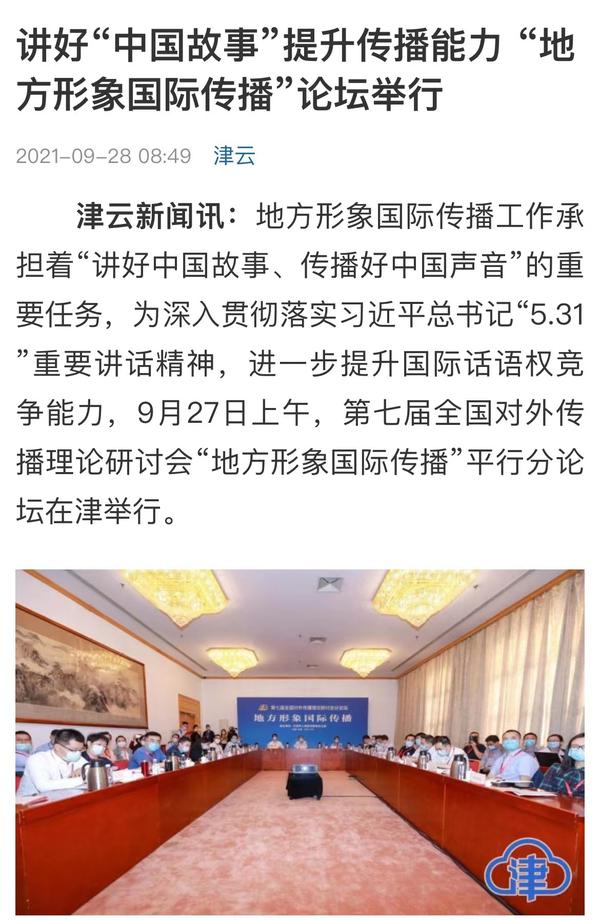 9月28日,天津市人民政府网以《强化责任感使命感 深化国际传播能力建设 第七届全国对外传播理论研讨会在津召开 研讨会设8个分论坛 “新时代的天津”图片展同步举行》为题,进行了报道。