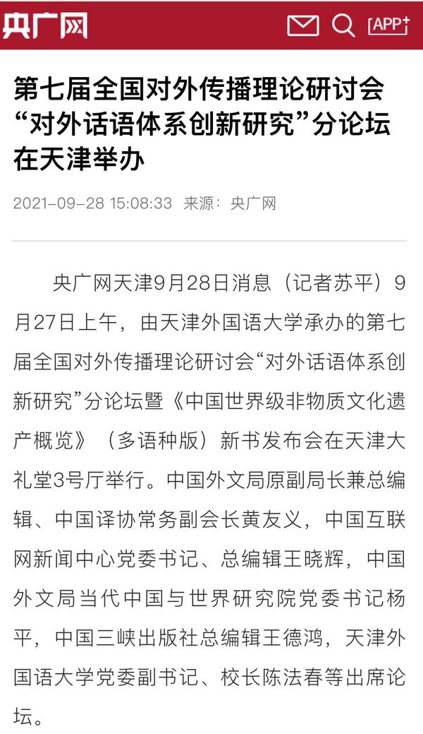 9月28日,央广网以《第七届全国对外传播理论研讨会“对外华语体系创新研究”分论坛在天津举办》为题,进行了报道。