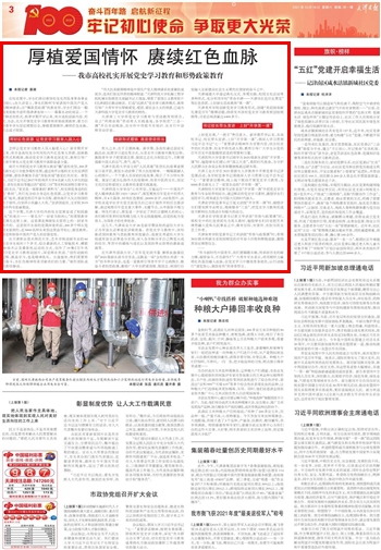 育人之本,在于立德铸魂。新学期,各高校通过创设实践活动、拓展学习途径等方式,从党史学习教育中激发信仰,激励青年学子把爱国之情、强国之志化为报国之行,不断增强做中国人的志气、骨气、底气。