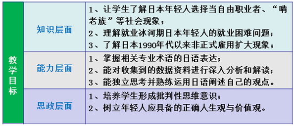本节课学习与讨论的内容主要是关于日本年轻人就业相关的课题,比较贴近学生的实际生活,能够引起学生较大的兴趣和足够的关注。预期本次课堂小组讨论热烈,学生的各种思想和观点在互动中相互碰撞,从而形成正确的认知。学生的思辨能力得到较大提高,学生态度积极向上,形成正确的人生观和价值观。