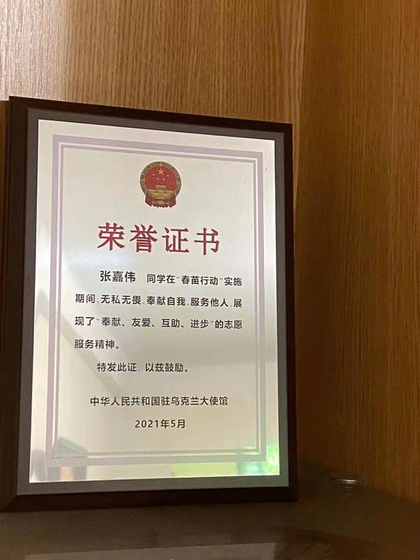 2021年4月,乌克兰尚未开始大规模接种疫苗。中国驻乌克兰大使馆开展了“春苗行动”, 为所有旅乌华人、留学生率先接种疫苗。由于使馆此次活动规模大,涉及人员多,组织工作艰巨,需要许多志愿者。在基语大孔院中方院长的动员和组织下,海外志愿者教师张嘉伟、秦博文、丁洋积极报名参加“春苗行动”的志愿服务。他们无私奉献、忘我工作,受到了中国驻乌克兰大使馆的特别嘉奖。