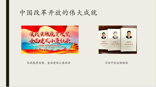 10min:总结本课内容,布置作业(搜集整理关于中国自改革开放以来取得成就的故事和实例,下节课做课堂发表。并在学习通上发帖进行讨论。)