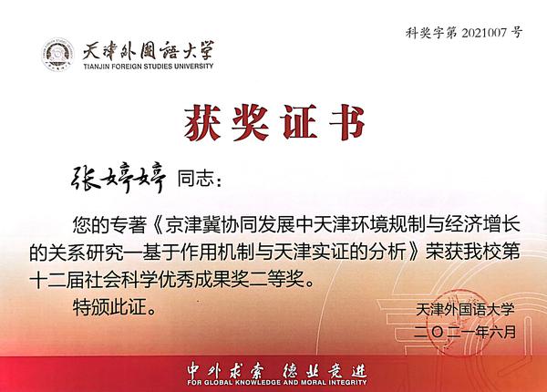 专著《京津冀协同发展中天津环境规制与经济增长的关系研究------基于作用机制与天津实证的分析》,ISBN:9787509664018 ,25.3万字,经济管理出版社2019年2月出版。
