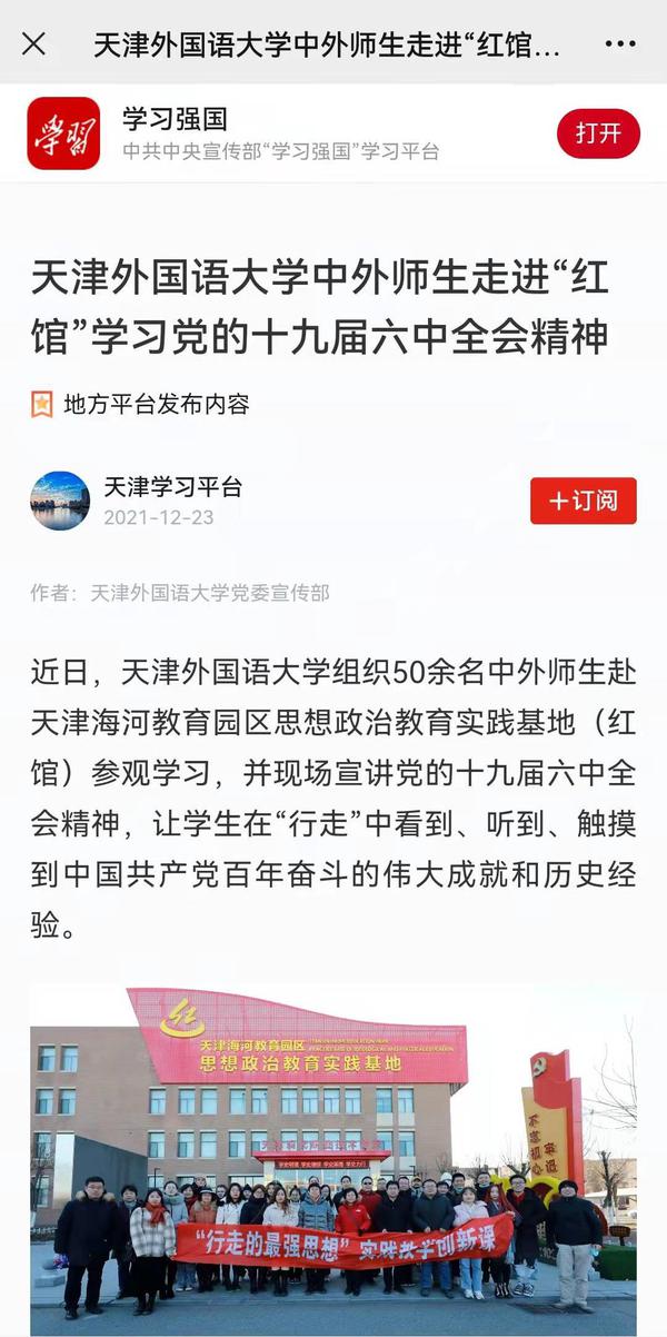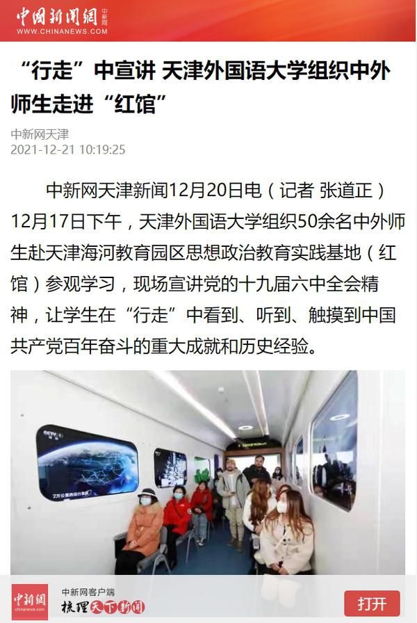 央广网以《天津外大组织中外师生走进“红馆” 在“行走”中宣讲党的十九届六中全会精神》为题进行了报道。