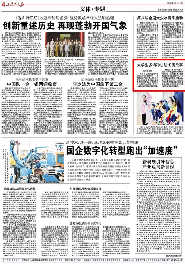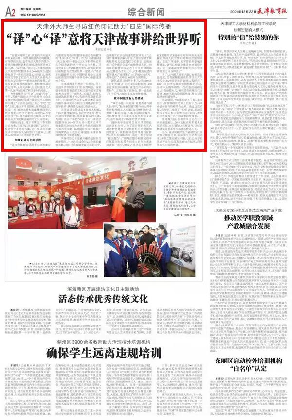 12月22日,《天津教育报》A2版以《“译”心“译”意 将天津故事讲给世界听》为题,深度采访报道了我校中国特色社会主义理论体系国际传播外译研究中心组织师生踏上“寻访红色印记 助力‘四史’宣传”之旅。