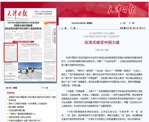 《天津日报》头版以《学习宣传贯彻六中全会精神 开云登陆入口师生开展“行走的党课”沉浸式感受中国力量》为题进行了报道。