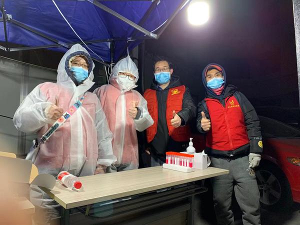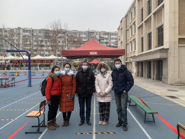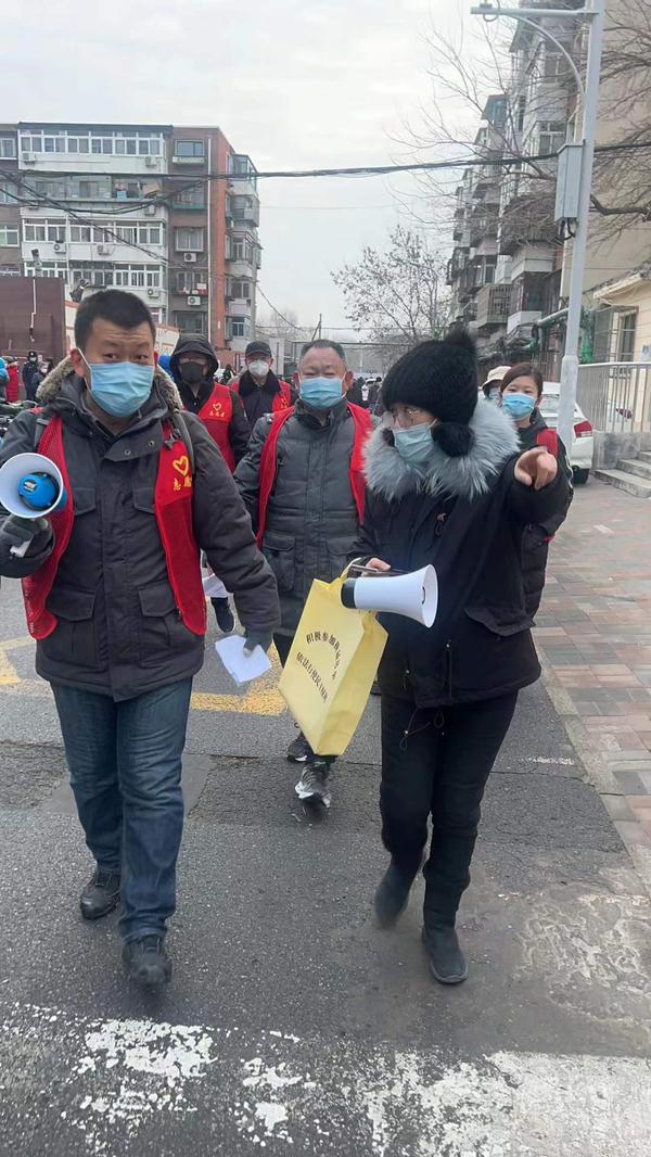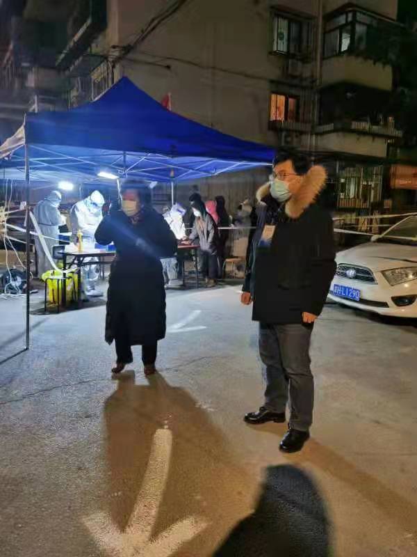 国内合作与校友联络工作处副处长郭晓明和爱人孙老师都是学校教职工,夫妻二人齐上阵,共同协助第二轮核酸筛查工作。张璐云老师协助社区撰写、张贴核酸检测通知,在寒风中奋战12个小时,完成1200余人的信息录入。苑菲老师,民盟盟员,接到通知后打车15公里前往河西区振才里社区开展志愿服务,组织居民排队等候,逐人测量体温,查验健康码,帮助老人下载软件、申领健康码,持续到第二天凌晨才从服务地点离开。
