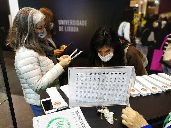 为增进当地民众对孔子学院的了解,孔子学院专门设计了有关汉语课程和文化活动信息的宣传页,深受参观者的青睐,首批印制的500张宣传页在展会第一天就被全部领完。孔子学院制作的虎年生肖书签也大受欢迎,其精美的设计和美好的生肖文化寓意引起参观者极大的兴趣,很多人拿到生肖书签后,就迫不及待地想了解自己虎年的运势。给自己起一个中文名字是很多葡萄牙人的心愿,也常常是他们第一次与中文亲密接触。展台前索要中文名字的人总是络绎不绝,而老师们为每个人精心书写的中文名字都会赢得真心的感谢。卡若琳娜(Carolina) 和马帝斯(Martis) 是葡萄牙北部莱利亚杜阿尔特中学高三的学生,在拿到写有自己中文名字卡片的时候兴奋不已。他们表示希望今年能考入里斯本大学,到孔子学院学习中文。