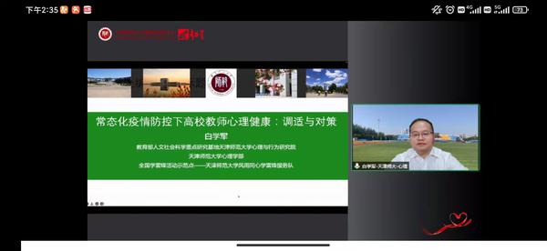 近期,为深入贯彻习近平总书记关于疫情防控工作重要指示精神,认真落实国务院、天津市委和天津市教育两委等各级部门防疫工作部署要求,充分发挥高校对教师群体的引领作用,切实守护广大教职工身心健康,积极应对当前疫情防控形势,我校联合天津市15所高校邀请全国知名心理学家,以《常态化疫情防控下高校教师心理健康:调适与对策》为题,共同举办专题网络公益讲座,切实引导广大高校教师缓解工作压力,做好心理调适,积极应对疫情产生的心理影响,为广大教职工履职尽责奠定良好心理基础。