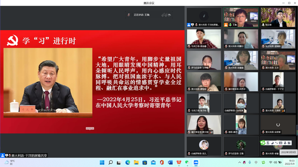 围绕习近平总书记对广大青年提出的“立大志、明大德、成大才、担大任”的期望,四位在青春赛道上奋力奔跑的“追梦人”分享了自己的故事。他们中有把握人生方向,立志毕业后投身新疆基层建设的“青马人”;有在今年1月份天津疫情形势严峻时协助社区完成多轮大筛任务,在默默奉献中擦亮青春底色的“志愿者”;有练就过硬本领,考取中国政法大学国际商务专业硕士研究生的“外语+”复合型人才;还有肩负历史使命,在2020年疫情暴发后第一时间投入天外志愿翻译突击队的“译行者”。非通用语学生党支部“寻找海外的马克思”实践团成员也通过视频的形式与大家分享了在海外留学期间,讲好中国故事、传播好中国声音、成为中外文化交流使者的故事。支部党员用八个外语语种畅谈青春,实现中国情怀的世界表达,感受奋进中国的青春力量。