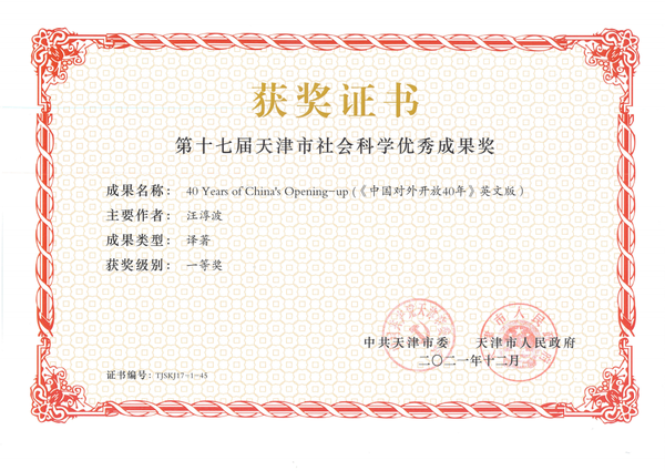 该成果荣获第十七届天津市社会科学优秀成果奖一等奖,实现了我校在该奖项上的历史性突破,为我校“十四五”科研建设取得良好开局奠定了坚实基础。证书编号:TJSKJ17-1-45。
