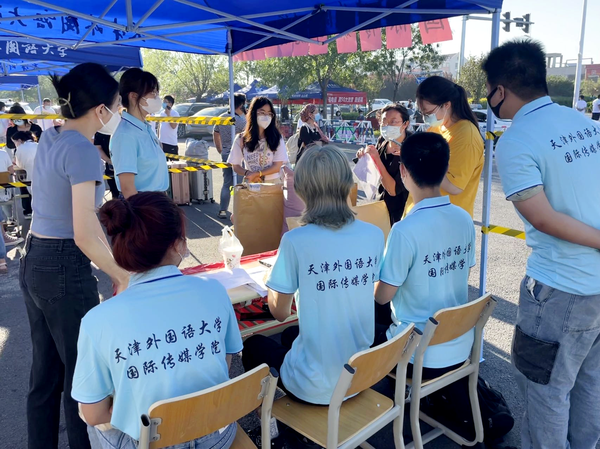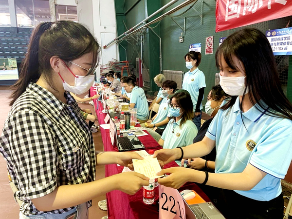 国际传媒学院充分发挥学生党员、入党积极分子和学生骨干的模范带头作用,组建迎新志愿服务先锋队,校门口、网球馆、宿舍楼等各处都有“国传蓝”的身影。他们帮助新生搬运行李、办理入住,为新生核验信息、发放材料,送上印有专属寄语的学院定制提袋和写有学姐学长寄语的“盲盒”明信片,热情地为每一位憧憬又懵懂的新生指路引航。
