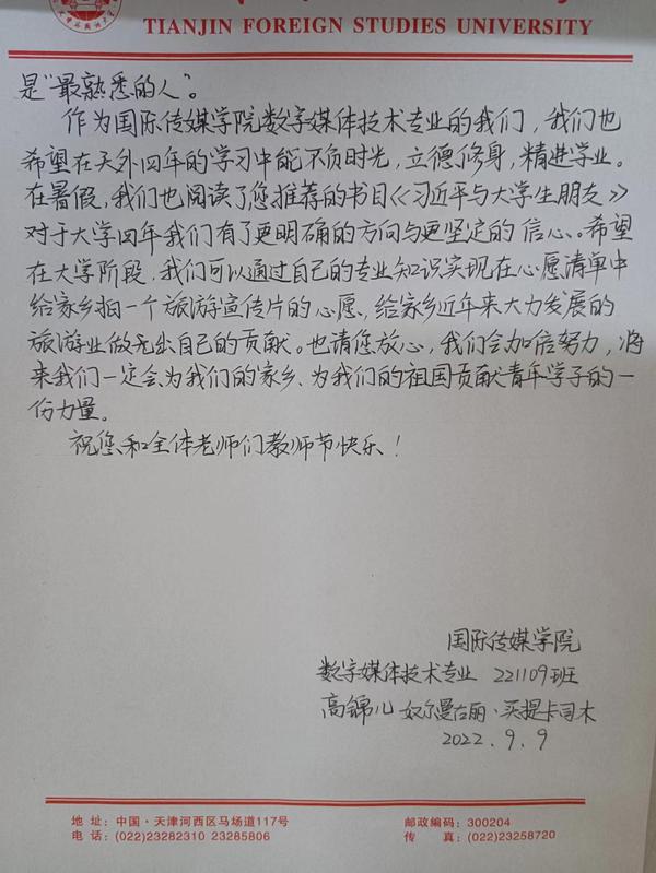 2022级数字媒体技术专业新生高锦儿,来自新疆维吾尔自治区塔城地区。离家3000多公里的她被学校和学院细致周到的工作和服务所感动。特别是在报到日当天,校党委书记殷奇与她的亲切交流令她倍感温暖,于是她写下一封感谢信,将感恩之情倾注笔尖。