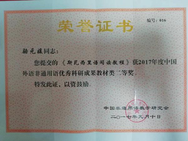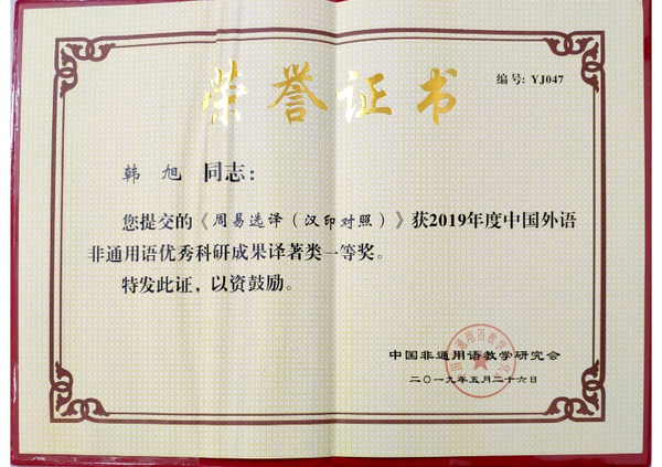 获2019年度中国外语非通用语优秀科研成果译著类一等奖