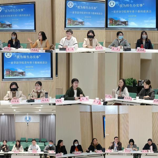 为进一步倾听基层教师对学校发展的意见建议,解决教师在工作生活中遇到的难题,了解教师在职业发展中的难点,落实好“我为师生办实事”活动要求,10月12日下午,亚非语学院在逸夫楼大江厅召开青年骨干教师座谈会。校党委副书记胡志刚出席,与参会教师亲切交流,相关职能处室负责同志及学院班子成员参会,会议由学院党总支书记张海梅主持。