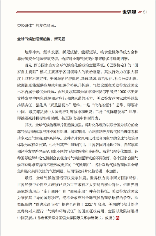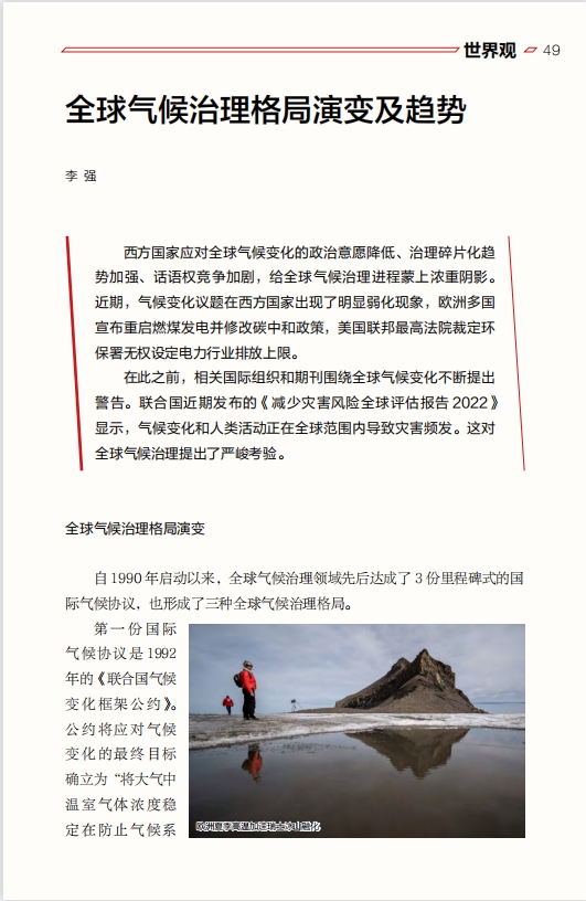 近日,《半月谈内部版》2022年10月刊出版发行,收录了我校国际关系学院院长李强教授文章《全球气候治理格局演变及趋势》。文章深入分析了全球气候治理格局演变,以及全球气候治理新趋势、新问题,指出西方国家应对全球气候变化的政治意愿降低,全球气候治理碎片化趋势加强、话语权竞争加剧等问题,给应对全球气候变化带来诸多不确定因素。