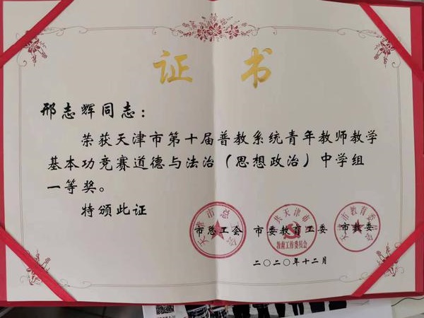 邢志辉老师荣获天津市普教系统青年教师教学基本功一等奖