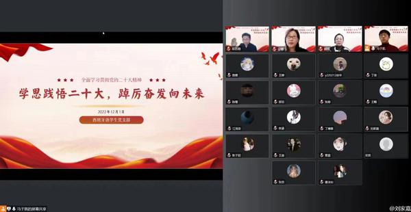 活动中,全体党员重温入党誓词。西班牙语学生党支部书记马于凯通过关键词的形式,以六组数字梳理了党的二十大报告中部分重要的内容,帮助同学们深刻理解和把握党的二十大的主题,深入学习贯彻党的二十大精神。