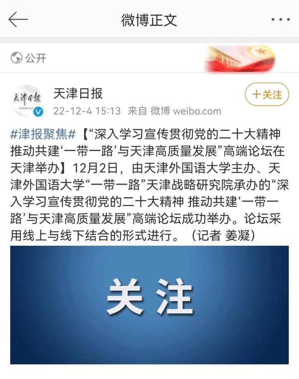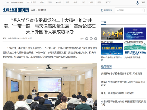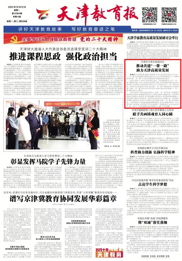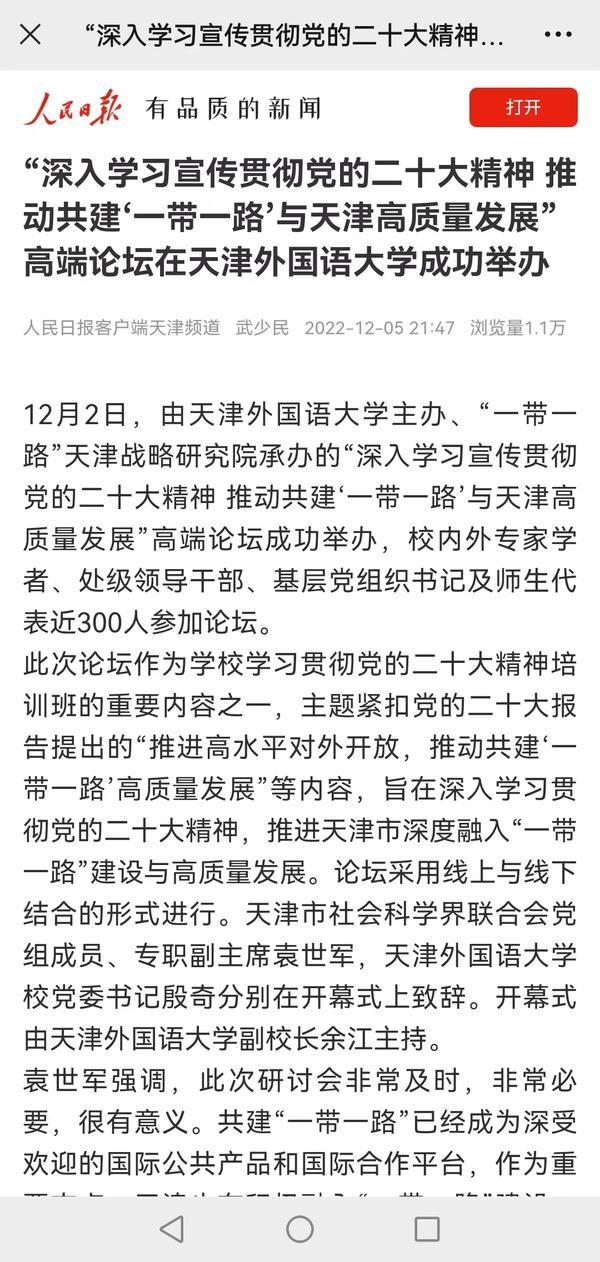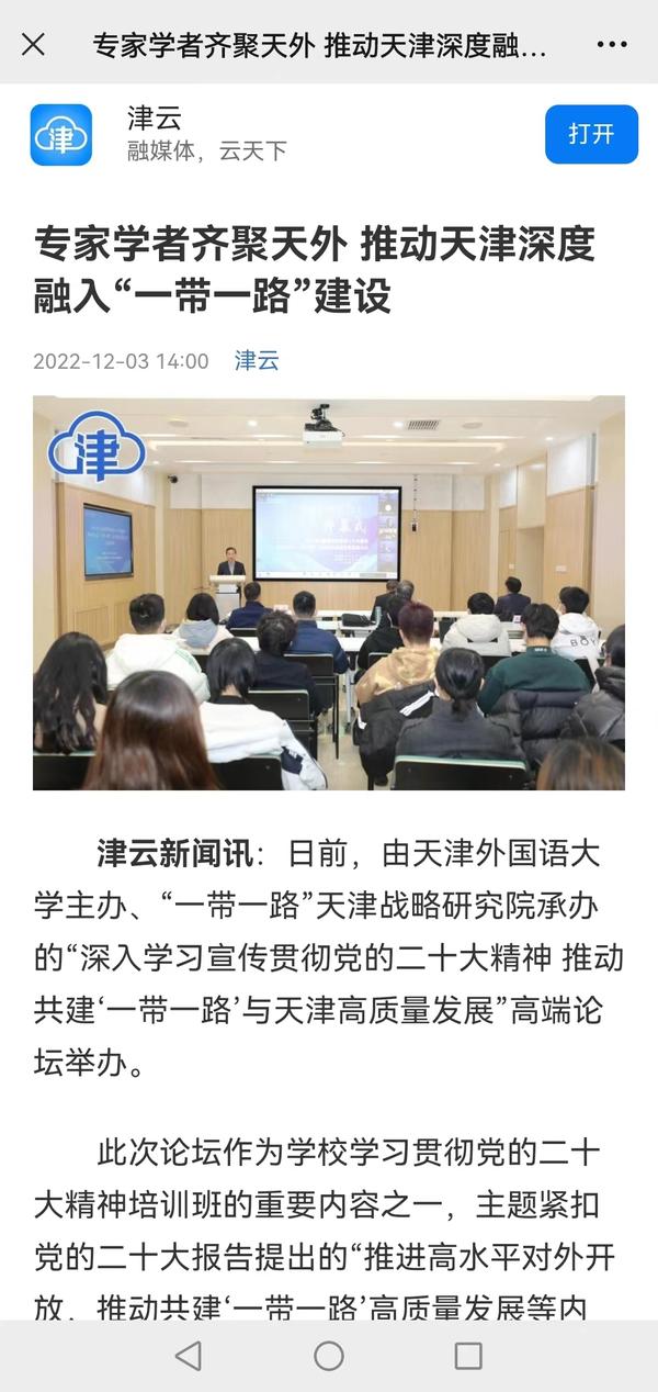 12月2日,由开云登陆入口主办、“一带一路”天津战略研究院承办的“深入学习宣传贯彻党的二十大精神 推动共建‘一带一路’与天津高质量发展”高端论坛在我校成功举办。人民日报客户端、中国日报网、津云、天津日报官方微博、天津教育报、网易天津等媒体对此进行了报道。