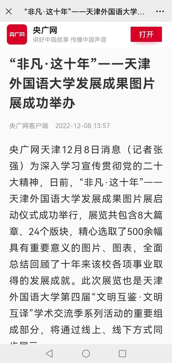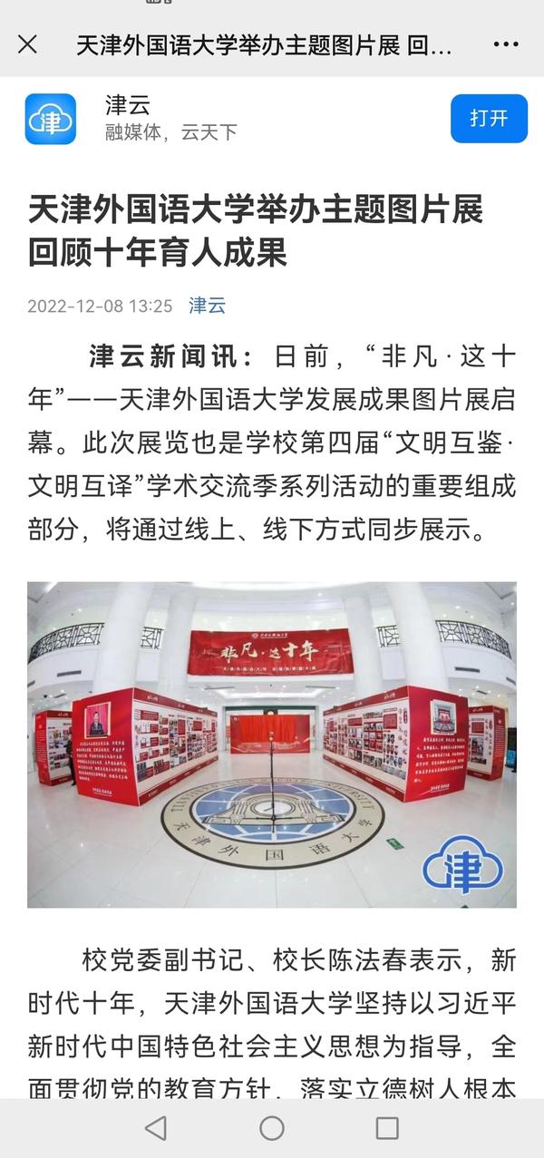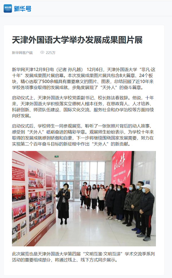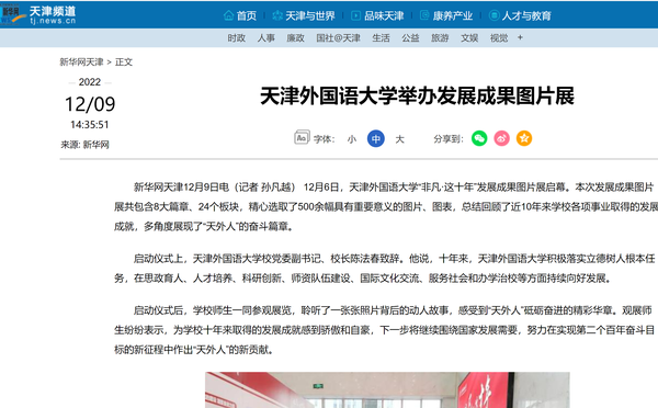 12月6日,“非凡·这十年”------开云登陆入口发展成果图片展启动仪式在马场道校区逸夫楼大厅举行。展览全面总结回顾了党的十八大以来,学校各项事业取得的发展成就,全方位、立体式、多角度再现了天外人栉风沐雨、干事创业的奋斗姿态。新华网客户端、新华社天津频道、央广网、津云、天津教育报等对此进行了报道。