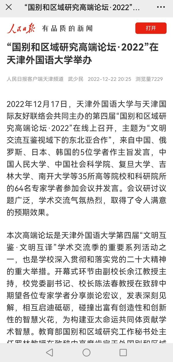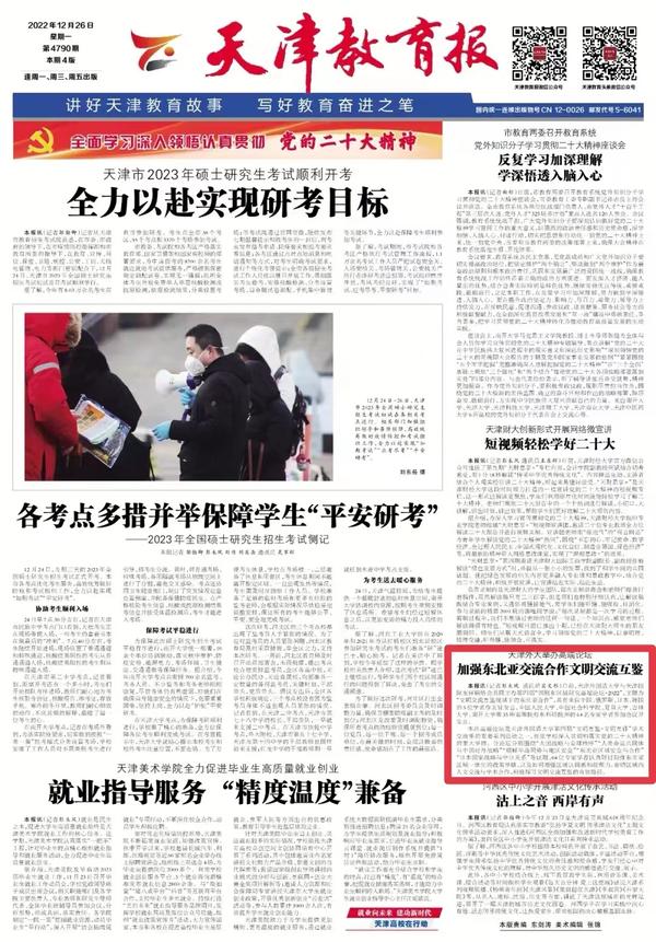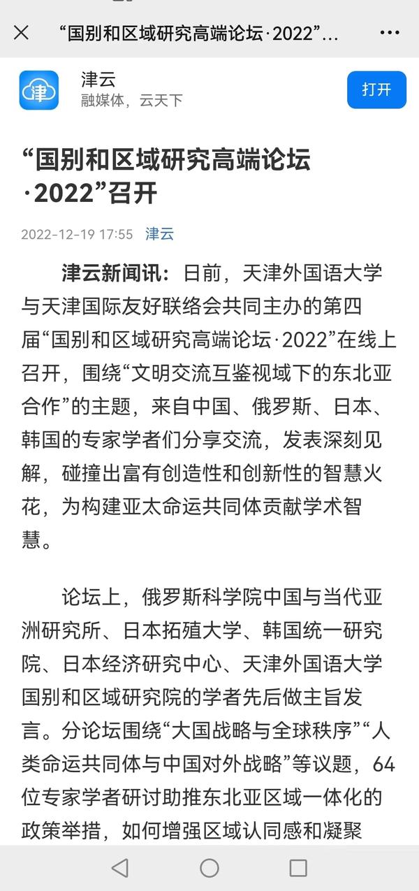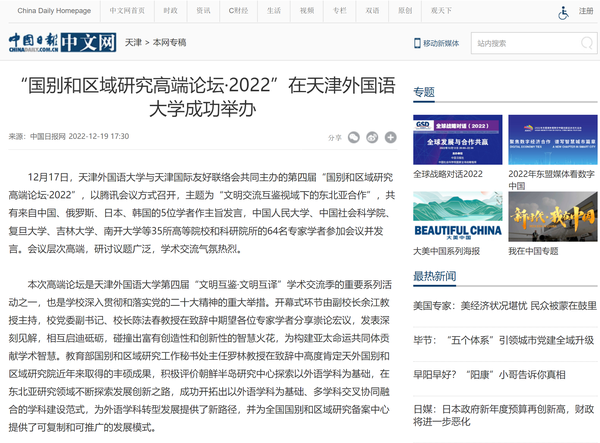 12月17日,我校与天津国际友好联络会共同主办的第四届“国别和区域研究高端论坛·2022”召开,主题为“文明交流互鉴视域下的东北亚合作”,共有来自中国、俄罗斯、日本、韩国的5位学者作主旨发言,35所高等院校和科研院所的64名专家学者参加会议并发言。人民日报客户端、中国日报网、津云、天津教育报等对此进行了报道。