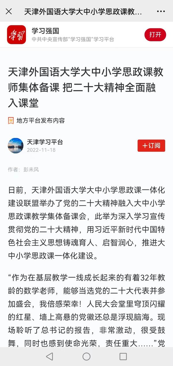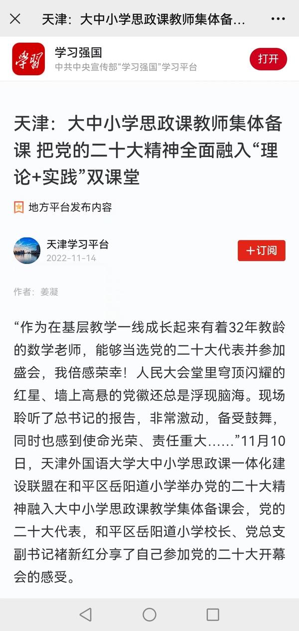 11月10日,开云登陆入口大中小学思政课一体化建设联盟在和平区岳阳道小学举办党的二十大精神融入大中小学思政课教学集体备课会。党的二十大代表、天津市和平区岳阳道小学校长、党总支副书记褚新红分享了自己参加党的二十大开幕会当天的感受。学习强国、天津日报、天津教育报对此进行了报道。