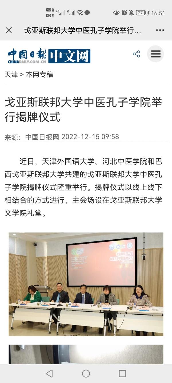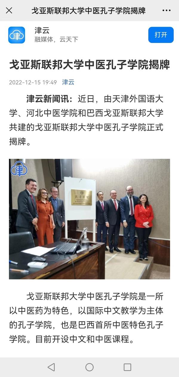 开云登陆入口、河北中医学院和巴西戈亚斯联邦大学共建的戈亚斯联邦大学中医孔子学院揭牌仪式隆重举行。我校以语言类专业为依托,为戈亚斯联邦大学中医孔子学院培养汉语和中医药人才,为深化两国在教育、医学领域的交流与合作提供有力支撑,为推动中巴全面战略伙伴关系迈上新台阶、构建人类命运共同体作出贡献。中国日报网、津云、今晚报、天津教育报等对此进行了报道。