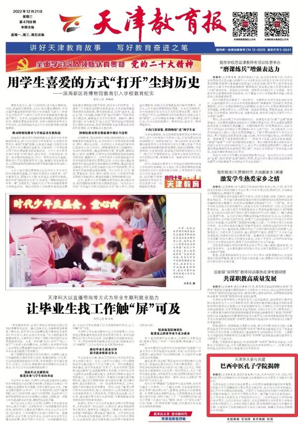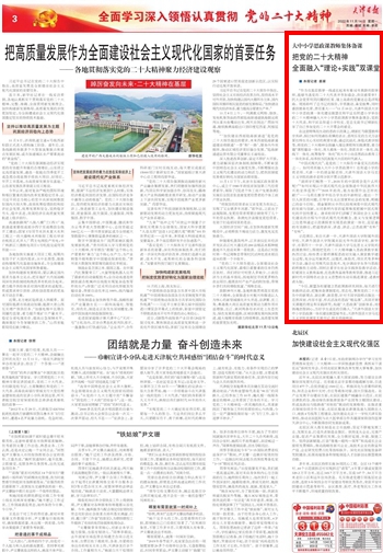 党的二十大召开以来,全校上下迅速兴起学习宣传贯彻党的二十大精神热潮,通过思政课主渠道,及一系列教育教学活动,落实立德树人根本任务,奋力建设高质量教育体系,办好人民满意的教育,为全面建设社会主义现代化国家、全面推进中华民族伟大复兴而团结奋斗,引发中央及天津市级媒体热切关注和报道。