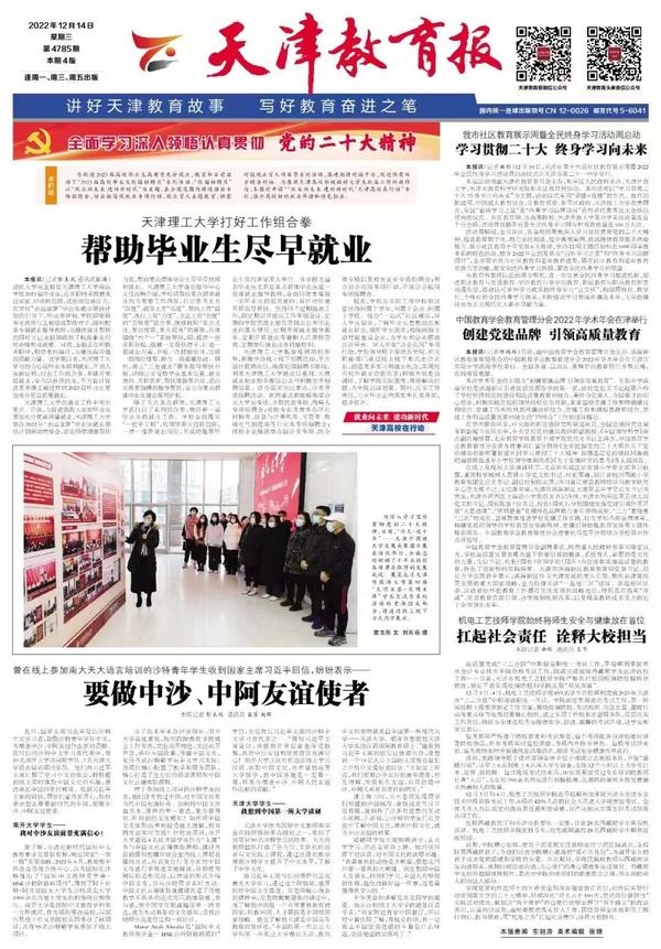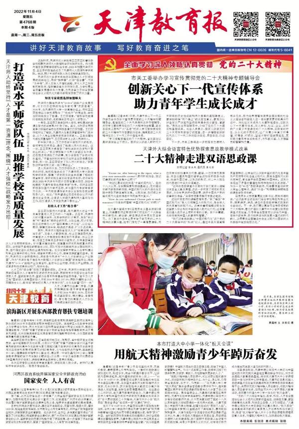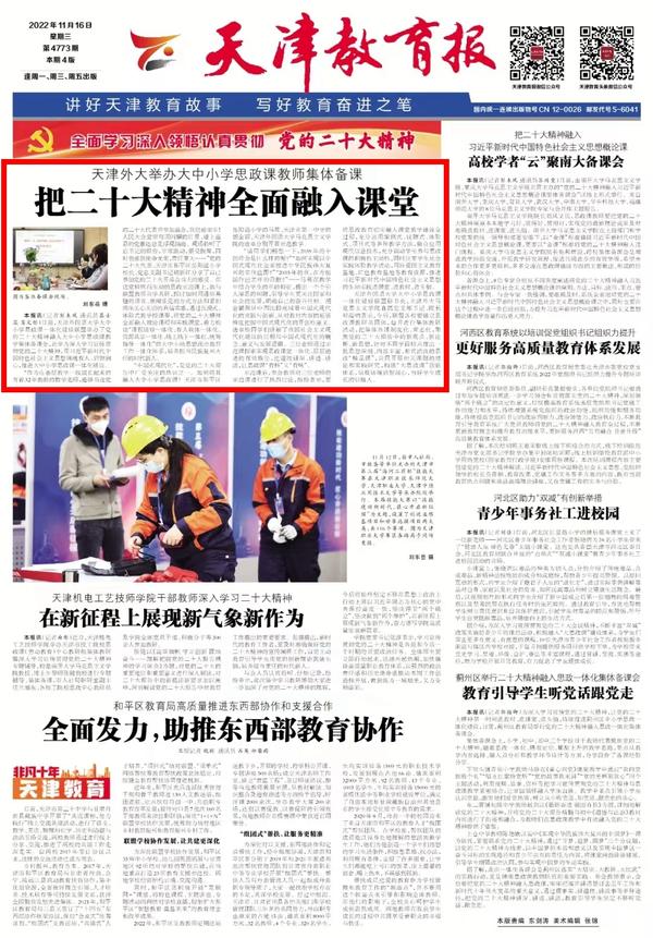 11月2日,马克思主义学院举行双语思政课示范课教学展示活动,带领同学们对党的二十大报告的新观点、新论断、新思想进行中英文双语学习。天津日报、天津教育报对此进行了报道。