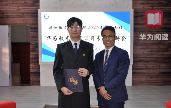 华为运营商BG全球销售部为已签约华为技术有限公司企业BG全球伙伴发展与销售部、2023届葡萄牙语专业毕业生郭天瑞颁发“华为客户经理校园大使”聘任证书。