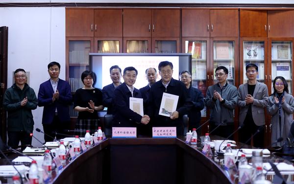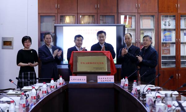 中央党史和文献研究院有关部门负责同志和我校领导共同为中央文献翻译研究基地揭牌,张士义、陈法春签署协议书。