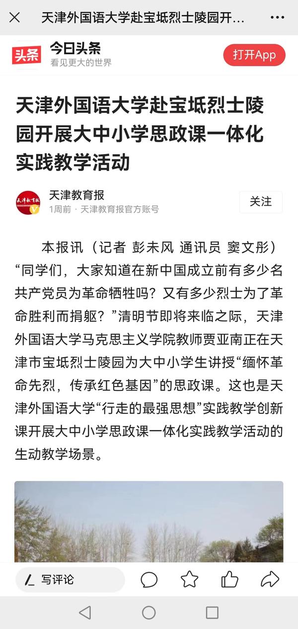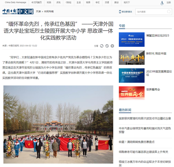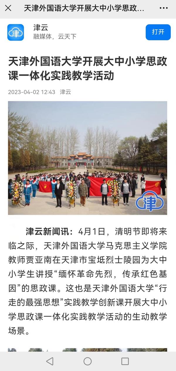 4月1日,清明节即将到来之际,开云登陆入口马克思主义学院教师贾亚南在宝坻区烈士陵园为大中小学学生开展“缅怀革命先烈 传承红色基因”思政课。这也是开云登陆入口“行走的最强思想”实践教学创新课开展大中小学思政课一体化实践教学活动创设的教学情景。中国日报网、央广网、天津日报、津云、天津教育报、宝坻新闻等多家媒体对此进行了报道。