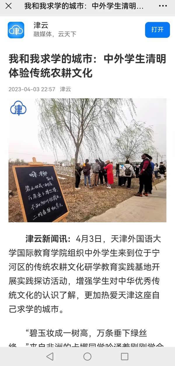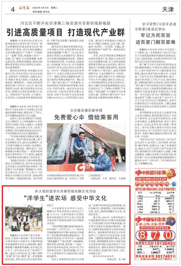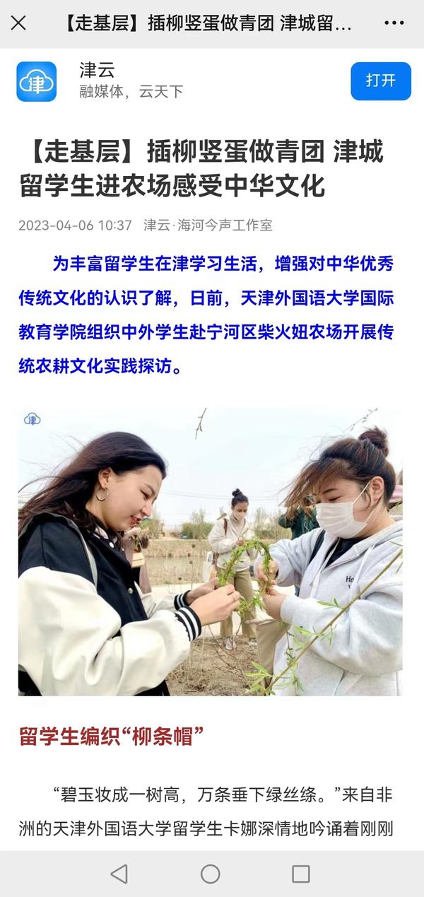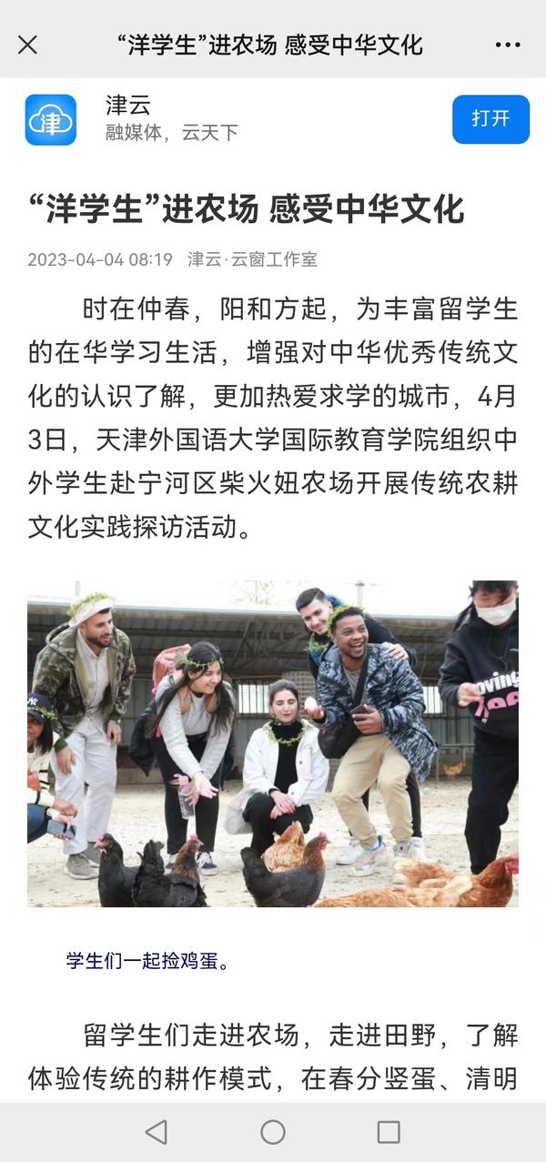 为丰富留学生的在华学习生活,增强对中华优秀传统文化的认识了解,更加热爱求学的城市,4月3日,开云登陆入口国际教育学院组织中外学生赴宁河区柴火妞农场开展传统农耕文化实践探访活动。人民网、新华社客户端、中国日报网、天津卫视《泊客中国》栏目、天津日报、津云、今晚报、宁河融媒体等多家媒体对此进行了报道。