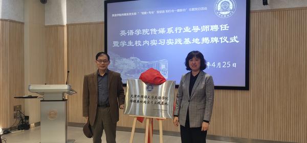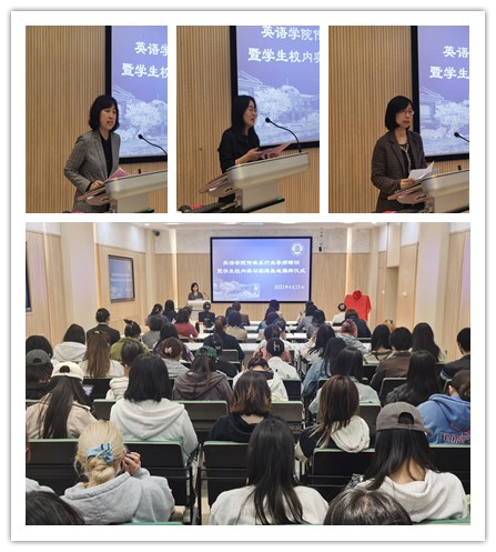 近日,英语学院传媒系党支部在逸夫楼大江厅举行“‘党建+专业’双促进 知行合一建新功”主题党日暨校内实习实践基地揭牌仪式,全体党员参会。活动邀请学校国内合作与校友工作联络处副处长郭晓明、英语学院领导班子以及传媒系学生代表共同参与。会议由传媒系党员代表、英语学院副院长李媛霞主持。
