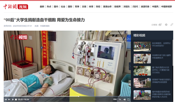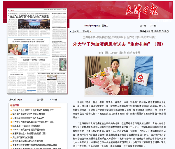 5月8日,我校“00后”大学生小周在天津市第一中心医院成功捐献造血干细胞,成为天津市第351例、我校第23例造血干细胞捐献者,为千里之外的血液病患者送去“生命的礼物”。