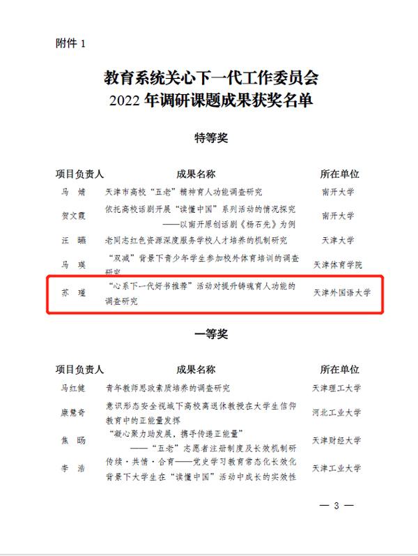 近日,在天津市教育系统关工委召开的高校职校重点工作推动会上,市教育系统关工委副主任张金钟同志通报了《关于教育系统关工委2022年调研课题评审奖励的决定》(津教关〔2023〕7 号),由我校苏瑾老师申报的《“心系下一代好书推荐”活动对提升铸魂育人功能的调查研究》重点课题荣获调研课题成果特等奖。