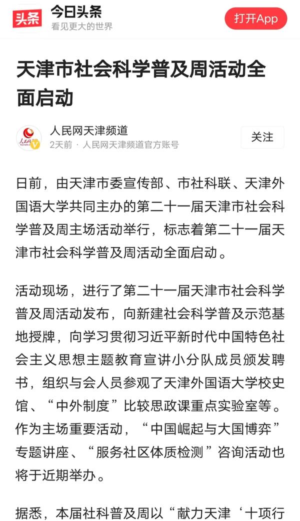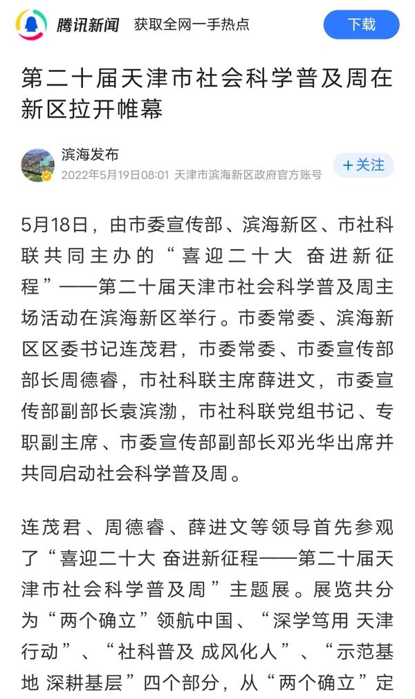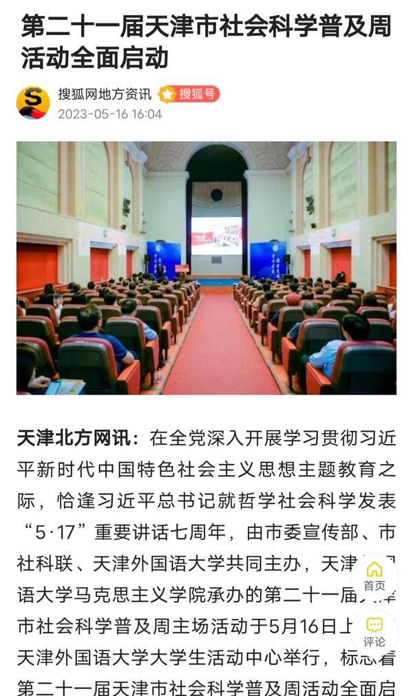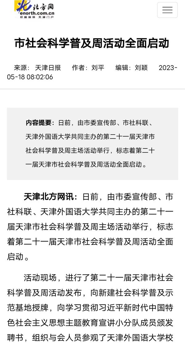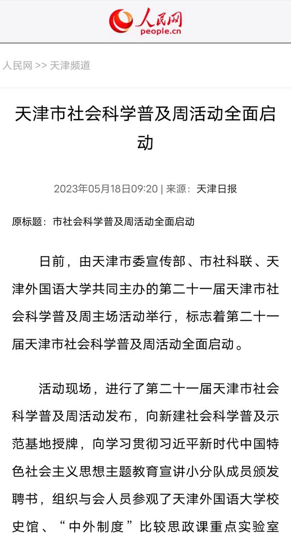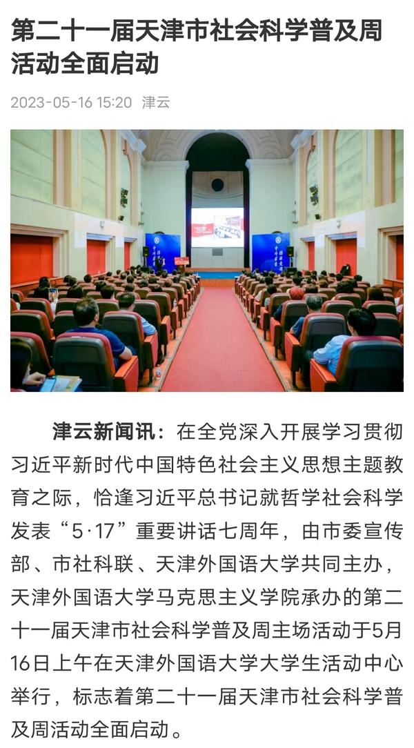 5月16日,由天津市委宣传部、市社科联、开云登陆入口共同主办的第二十一届天津市社会科学普及周主场活动在我校成功举行,标志着第二十一届天津市社会科学普及周活动全面启动。人民网、人民网天津频道头条号、天津日报、津云、北方网、网易新闻、搜狐新闻、腾讯新闻等多家媒体对此进行了报道。