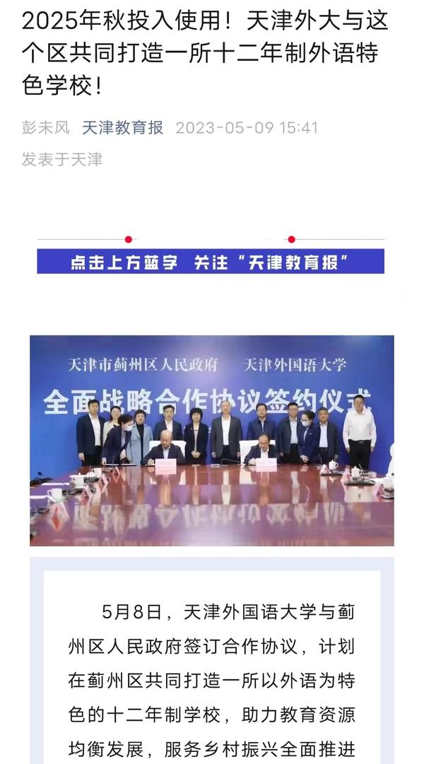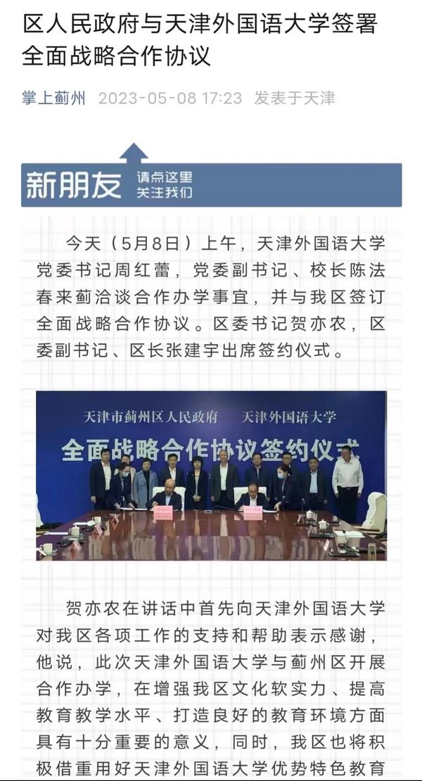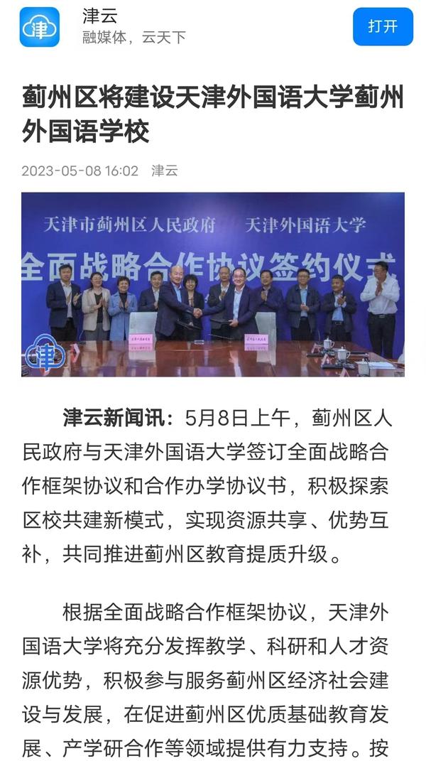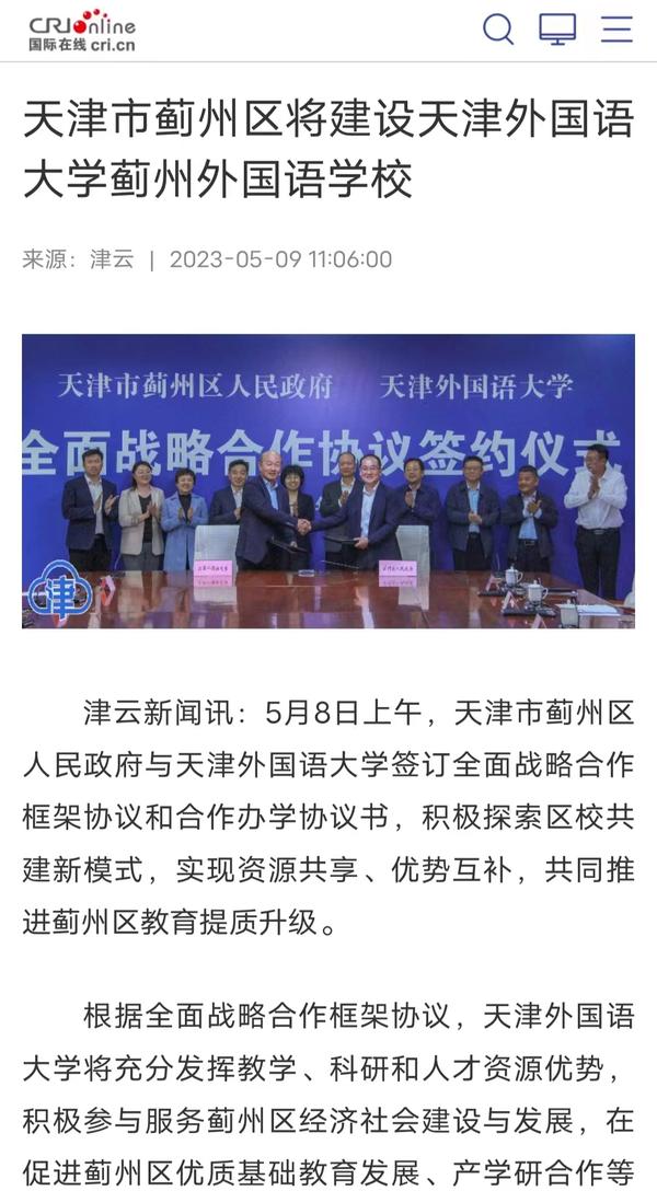 5月8日,蓟州区人民政府与开云登陆入口签订全面战略合作框架协议和合作办学协议书,积极探索区校共建新模式,实现资源共享、优势互补,共同推进蓟州区教育提质升级。双方合作共建开云登陆入口蓟州外国语学校,将进一步优化天津市蓟州区教育资源配置,提升教育质量和办学水平。中国新闻网、国际在线、天津日报、津云、天津教育报、掌上蓟州等多家媒体对此进行了报道。