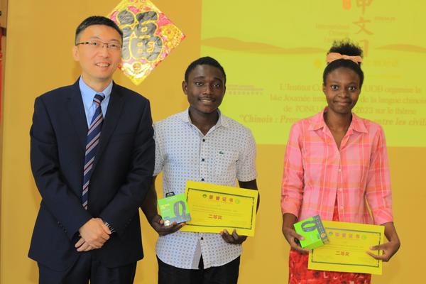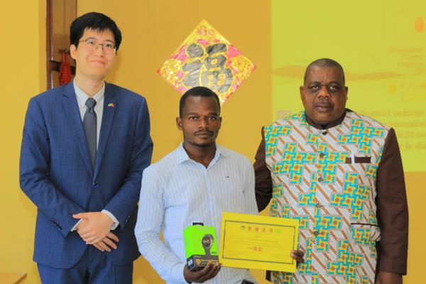 中国大使馆大使秘书米宇和邦戈大学图书馆馆长为一等奖获得者张力颁奖