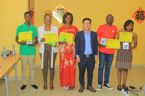 孔子学院首次举办了”书写、朗诵诗歌”比赛,中国驻加蓬大使馆随员米宇、中国援加蓬医疗队队长赵智成和队员范永娟作为评委,从书写和朗诵两方面为选手评分。最终,张力荣获本次比赛一等奖,文妮和Mombo Achille获得二等奖,其余选手获得优秀奖。