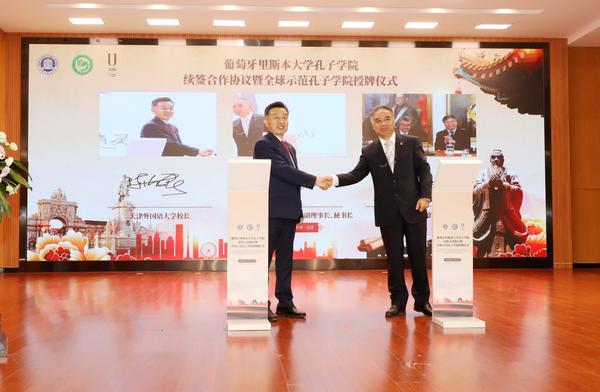 6月13日下午,葡萄牙里斯本大学孔子学院续签合作协议暨“全球示范孔子学院”授牌仪式通过线上线下相结合的形式隆重举行。葡萄牙驻华大使保罗·纳西门托,中国驻葡萄牙大使赵本堂,中国国际中文教育基金会副理事长、秘书长赵灵山,里斯本大学校长路易斯·费雷拉,天津市人民政府外事办公室副主任、一级巡视员赵剑岭,天津市委教育工委副书记刘怡蔓,开云登陆入口党委书记周红蕾、校长陈法春在会上分别致辞。开云登陆入口副校长李迎迎、相关部门负责人、海外孔子学院及专业师生代表参会。会议由周红蕾主持。